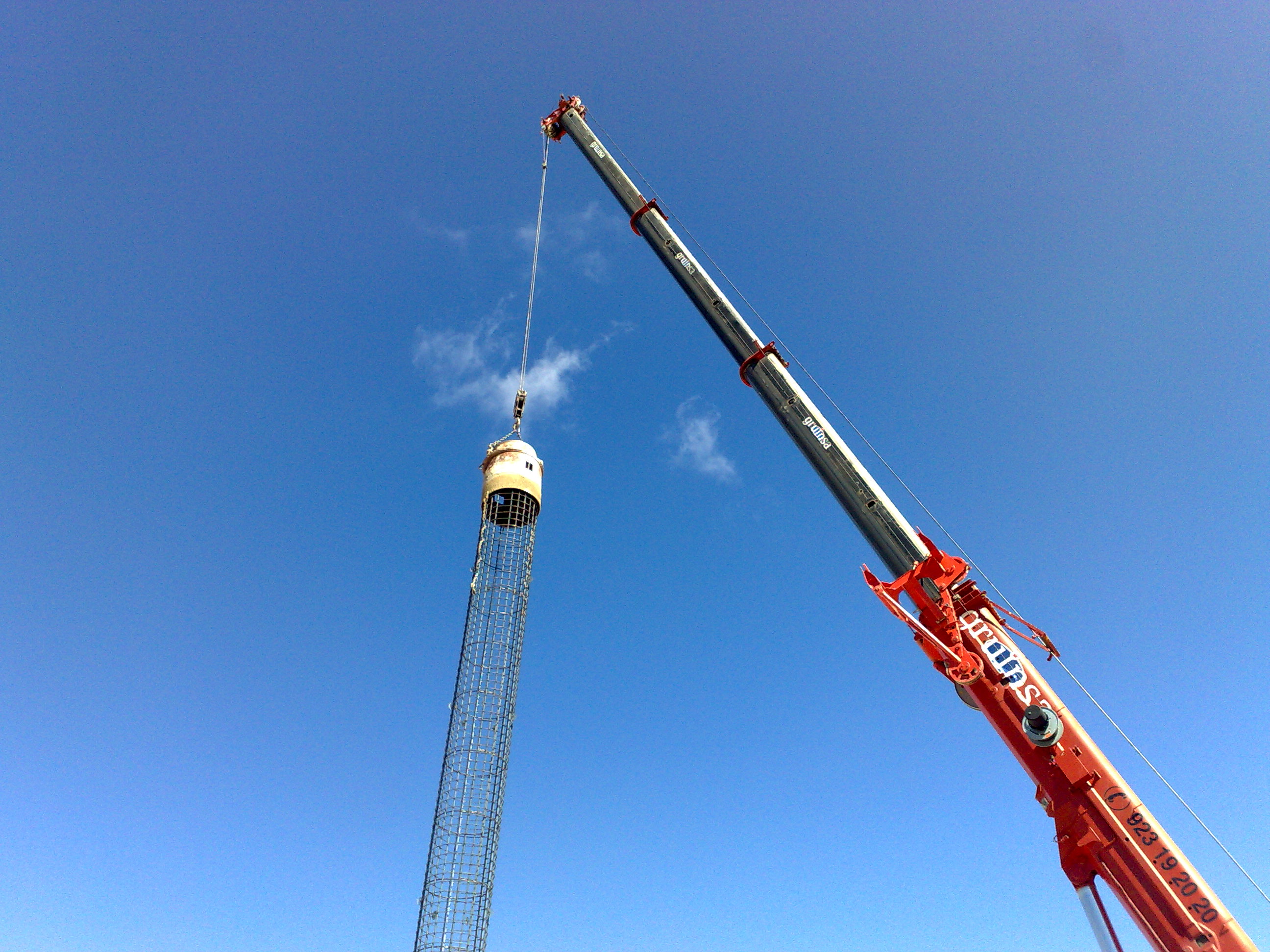 Than, the reinforcement bars are lifted using a crane and carefully inserted in the hole. Small plastic wheels are positioned at the sides of the steel structure to make easier to lower it in the hole.
