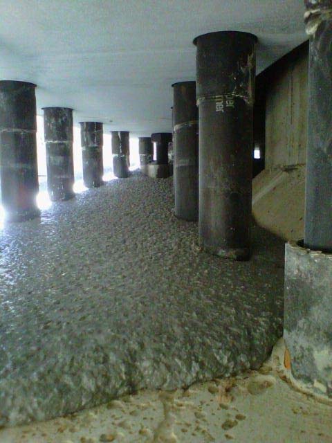 The grout layer seen from underneath the tower base flange. The anchor bolts pass through the flange, and the grout fills the entire space between the steel and the concrete pedestal. This thin layer must transfer compressive loads of several thousand kilonewtons without any voids or discontinuities.