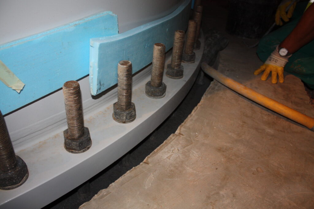 The second step is formwork installation. A ring of temporary formwork is placed around the base of the tower, enclosing the gap between the flange and the pedestal. This formwork is typically made from closed-cell foam (blue or white polystyrene boards), sealed to the concrete and the steel with mastic or foam sealant. The formwork must be watertight enough to contain the fluid grout, with openings left at specific points for the injection hose and for air vents. The grouting is performed from one side, and the grout must flow around the entire circumference — typically 4 to 5 metres in diameter — pushing air out through vents on the opposite side.