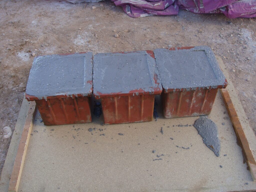 Additionally, cube or prism moulds are filled with grout from each batch for subsequent compression testing. Three moulds are standard per batch, and they are cured under conditions representative of the actual installation (not in a laboratory at controlled temperature — on site, next to the foundation). The moulds are tested at 24 hours, 7 days, and 28 days to verify that the grout achieves the specified compressive strength.