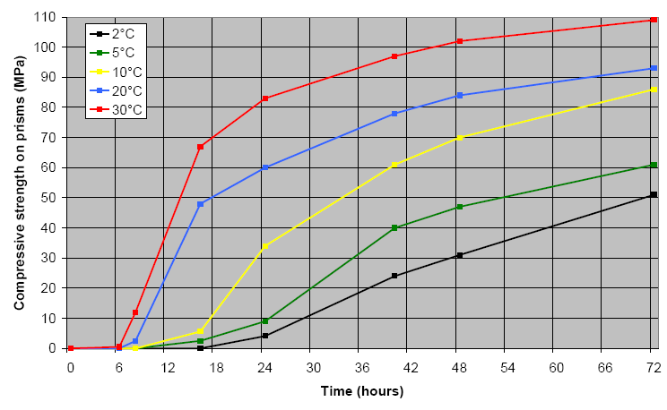 At 30°C, the grout reaches approximately 60 MPa within 18 hours — comfortably above most minimum requirements. But at 5°C, the same grout reaches barely 10 MPa in 18 hours and takes over 72 hours to reach 60 MPa. At 2°C, strength development is almost negligible for the first 24 hours.