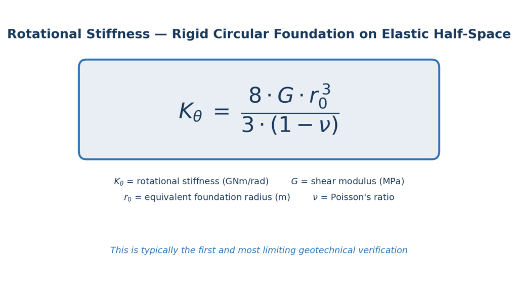 The OEM specifies a minimum rotational stiffness for the foundation-soil system, expressed in GNm/rad. This ensures the natural frequency stays safely between 1P and 3P (the soft-stiff design range, where many modern onshore turbines operate).