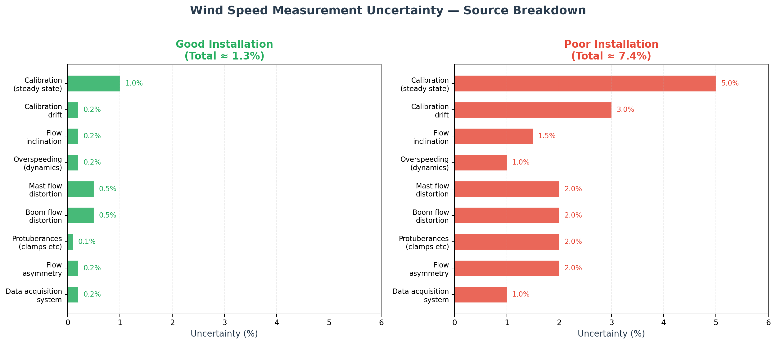 A 1.3% uncertainty in wind speed is the best you can realistically achieve — and this assumes Class 1 instruments, proper mounting, regular inspections, and careful post-processing. At the other end, a poorly executed campaign can have over 7% uncertainty in wind speed, which translates to roughly 20% uncertainty in energy production. That is the difference between a measurement you can take to the bank and one that is essentially useless for financial decisions.