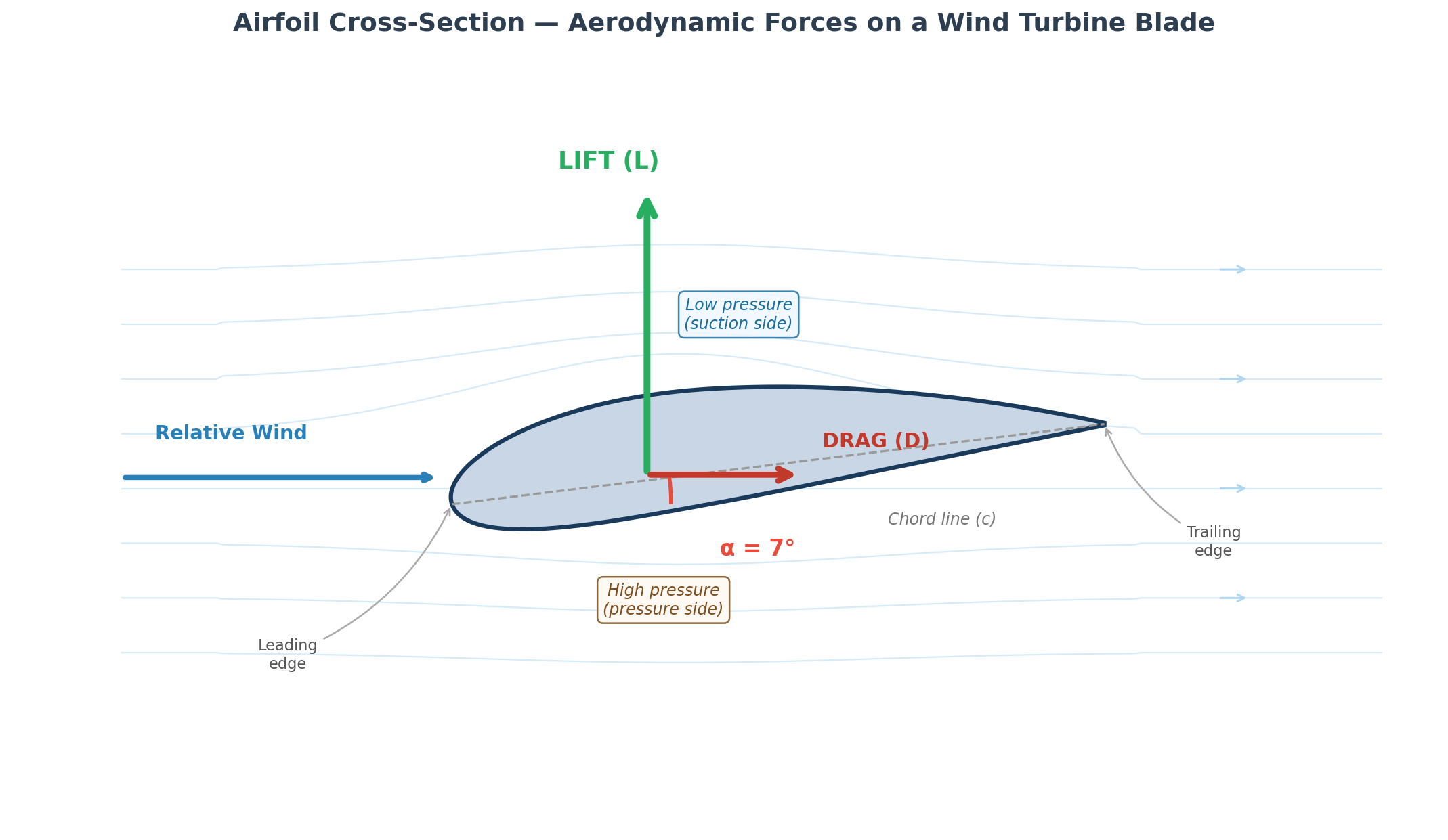 The blade of a wind turbine is not a flat plate. In cross section, each blade has an airfoil shape — a carefully designed profile that looks much like the wing of an aircraft. Understanding how an airfoil works is the single most useful piece of aerodynamic knowledge for a non-specialist.